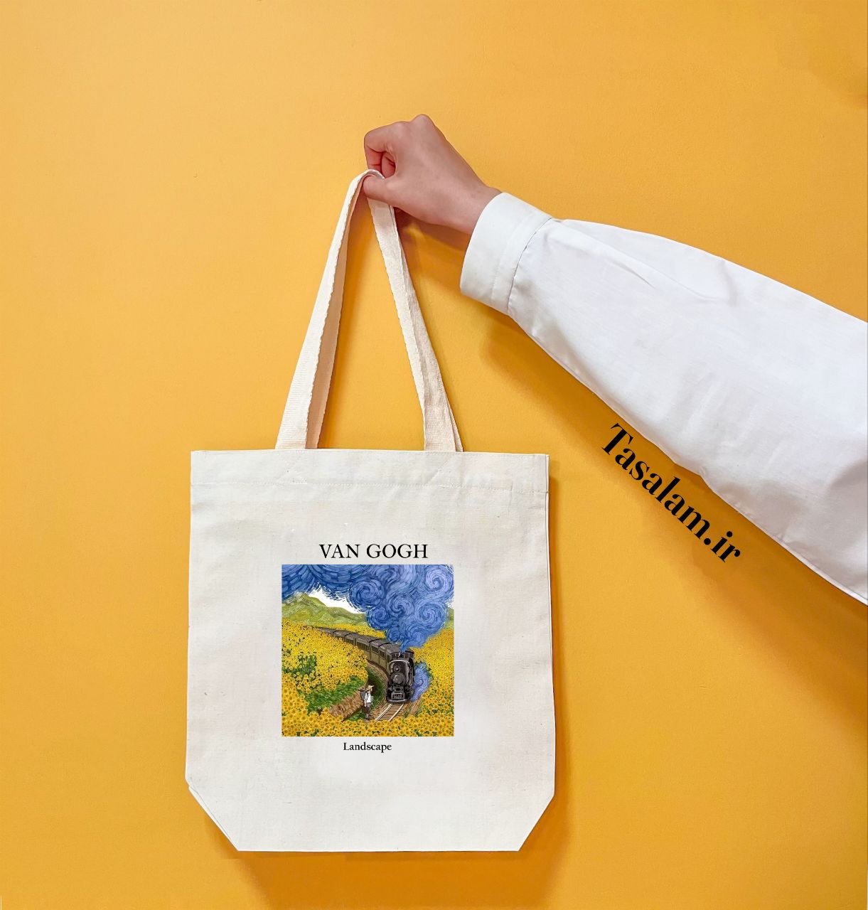 ساک دستی پارچهای الیاف طبیعی، طرح مزرعه آفتابگردان ونگوگ